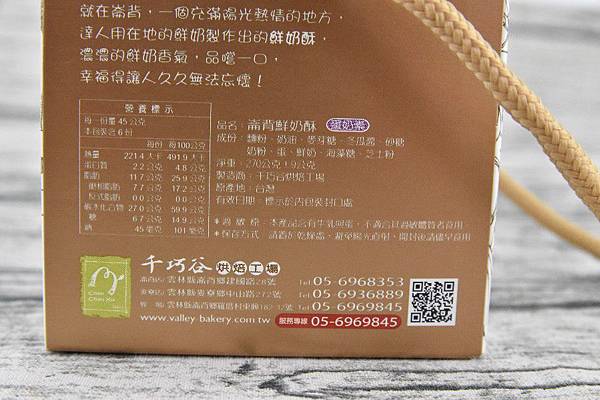 禮盒有千巧谷的聯絡方式,還有QR code可以掃描看到所有的甜點介紹,也有營養標示但小編覺得開心的享受好吃的鮮奶酥當下比在意熱量還要重要啦~而且鮮奶酥是蛋奶素甜點,所以吃素食的朋友也可以一起品嚐香濃的鮮奶酥喔!