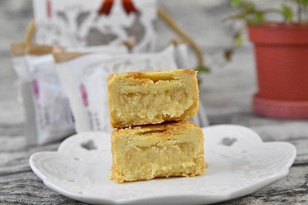 看看鮮奶酥的剖面,內餡用量相當扎實,小編忍不住偷咬了一口鮮奶酥,嘴裡就充滿了鮮奶香氣,金黃色外層餅皮具備香酥感,內層鮮奶內餡Q彈不黏牙,甜度適當而不失濃郁的鮮奶香,真的會讓人一口接一口,好吃不停手!