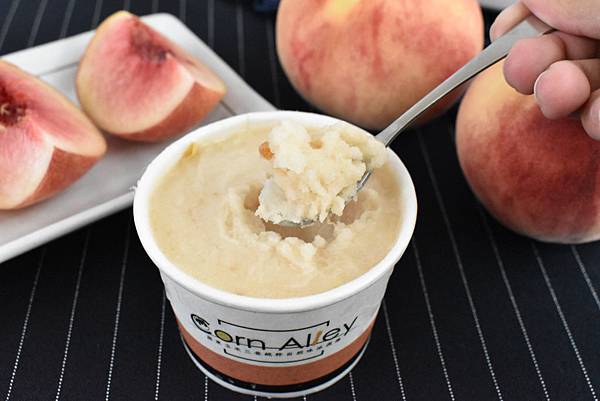 2018冰品推薦玉米三巷,除了在冰品原料的嚴格把關之外,玉米三巷的水果系列還是看得到果肉的厲害冰品!每一杯的水蜜桃雪酪都含有60%以上的水蜜桃,經過了長時間的熬煮之後,果肉與冰淇淋完美結合,讓你每一口都能吃得到果肉纖維,品嘗最原汁原味呈現的水蜜桃雪酪!