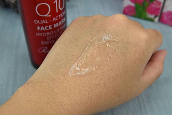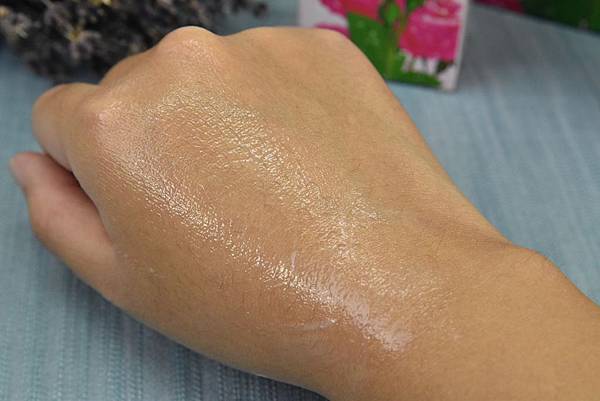 塗抹在手上,聞到大馬士革玫瑰精油的味道,非常清香,凍膜推開後,不黏膩,好推吸收快,摸起來皮膚嫩嫩的感覺,如果厚敷5分鐘,效果會更好喔!
