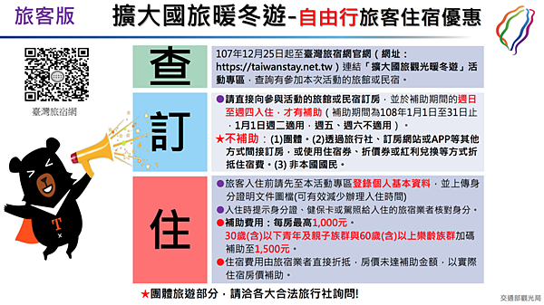 - 每晚每房可獲1000元補助,30歲以下、60歲以上者還能加碼多補500元。旅遊優惠補助最高可領1500。