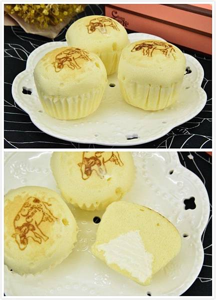 將崙背鮮奶蒸蛋糕取出放置在盤子上,一顆一顆圓圓的看起來可愛又療育。從切開的剖面能看到滿滿的內餡填滿蛋糕的下方,一口咬下便能深深體會那如雲般細緻的口感,鬆軟綿密的蛋糕體加上濃醇的鮮奶餡,吃起來十分清爽,完全顛覆一般對蛋糕的印象。
