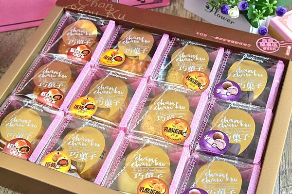 千巧谷中秋吟月禮盒是由四種口味的月餅所組成,其中包括紅豆Q心酥、蛋黃酥、乳酪蛋黃酥跟芋頭酥。這款中秋禮盒的內容物都是獨立分裝,讓人容易品嘗不沾手,繽紛色彩的貼紙標記使人能更清楚分辨出每個口味。