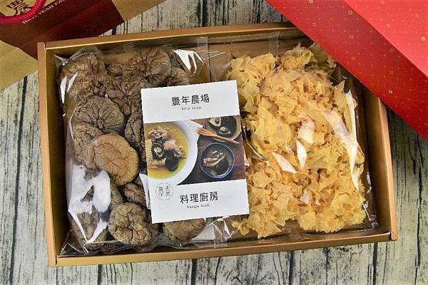 禮盒的名稱叫做「雙囍菇禮盒」,我們買的是香菇+白木耳的組合,覺得比較適合長輩,香菇可以燉湯、白木耳可以燉甜品~