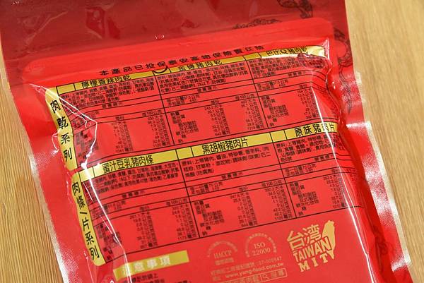 楊家香肉乾的包裝設計主要走紅色與金色路線,喜氣洋洋且美觀大方,不論是自己買來當作零食,或是買來送人,都是非常不失禮數的禮品哦!而且,商品都採密封包裝並附夾鍊條,讓你買的時候安心,吃不完的時候也能放心保存哦!